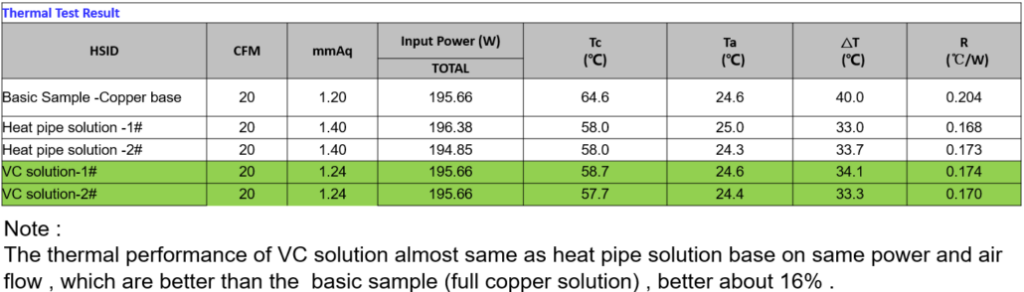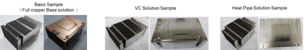 Interested to see our case study of different designs in an in-dept test? We have determined a cost-effective 200W solution for our customer. Based on same power consumption and similar air flow, both heatpipe solution and vapor chamber (VC) solution are better than full copper cooler by 16%.
